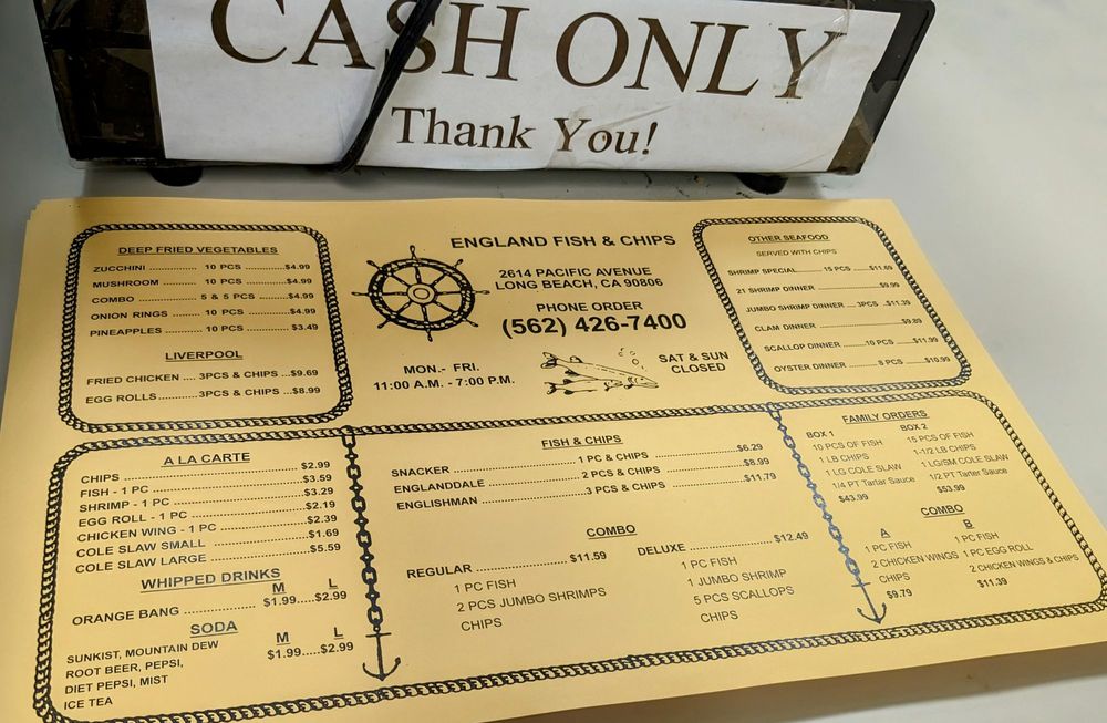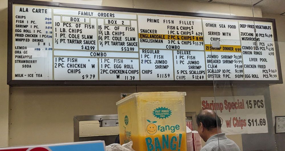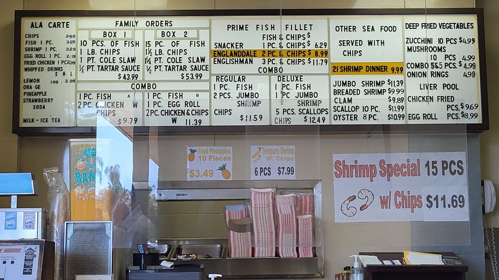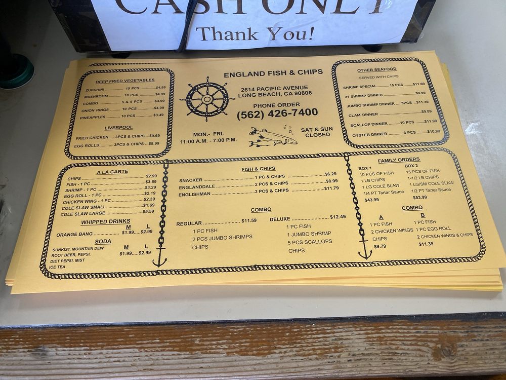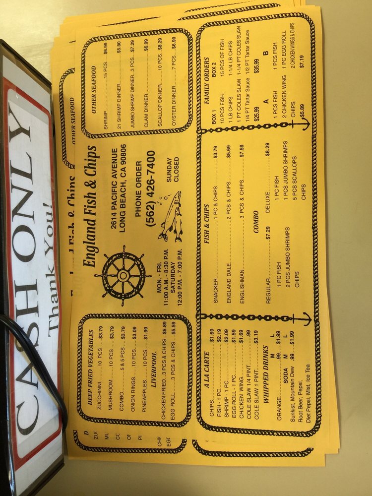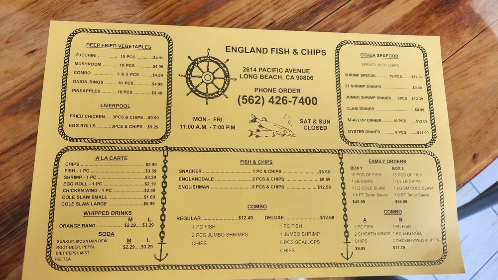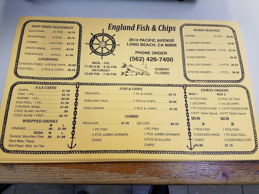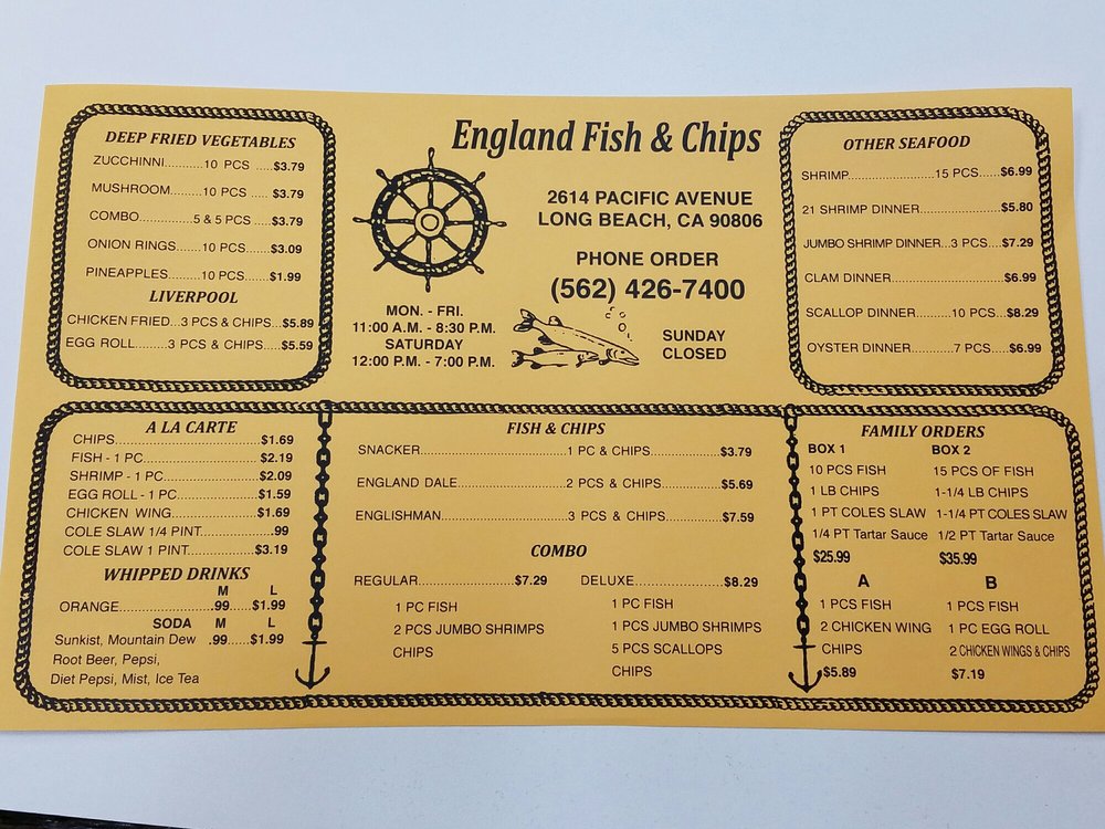 England Fish & Chips is a seafood haven offering classic fish and chips. Located in Long Beach, CA, this spot exudes a cozy, mom-and-pop vibe with friendly service. Customers rave about the generous portions and affordable prices, making it a hidden gem worth trying. The jumbo shrimp and fish fillets are crispy and flavorful, while the tartar sauce and coleslaw add a delicious touch. The Asian couple owners ensure a warm atmosphere, and the casual setting is perfect for a laid-back dining experience. Don't miss out on their prime fish fillets fried to perfection and paired with crispy fries. For a taste of authentic fish and chips, along with other delectable seafood options, England Fish & Chips is the go-to spot in town.